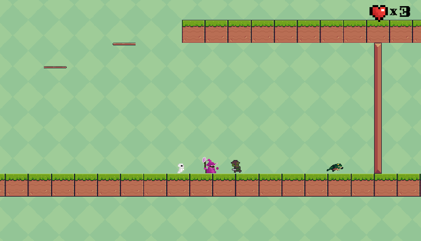 Para probar la idea con situaciones concretas, construimos tres tipos de enemigos iniciales, cada uno asociado a una habilidad distinta. El primero otorga doble salto, que permite alcanzar plataformas más altas y superar obstáculos de gran longitud. El segundo habilita correr con impulso por 2 segundos, lo que podrá servir para tomar impulso para saltar más lejos o arrancar de los enemigos en algunos casos. El tercero permite hacer invisible al jugador por 2 segundos, con lo que puede atravesar enemigos, obstáculos y paredes para entrar a zonas cerradas del mapa. En los tres casos, repetir el mismo tipo consecutivamente acumula la misma habilidad, si se cambia de tipo, se pierde lo acumulado y se comienza a acumular otra.